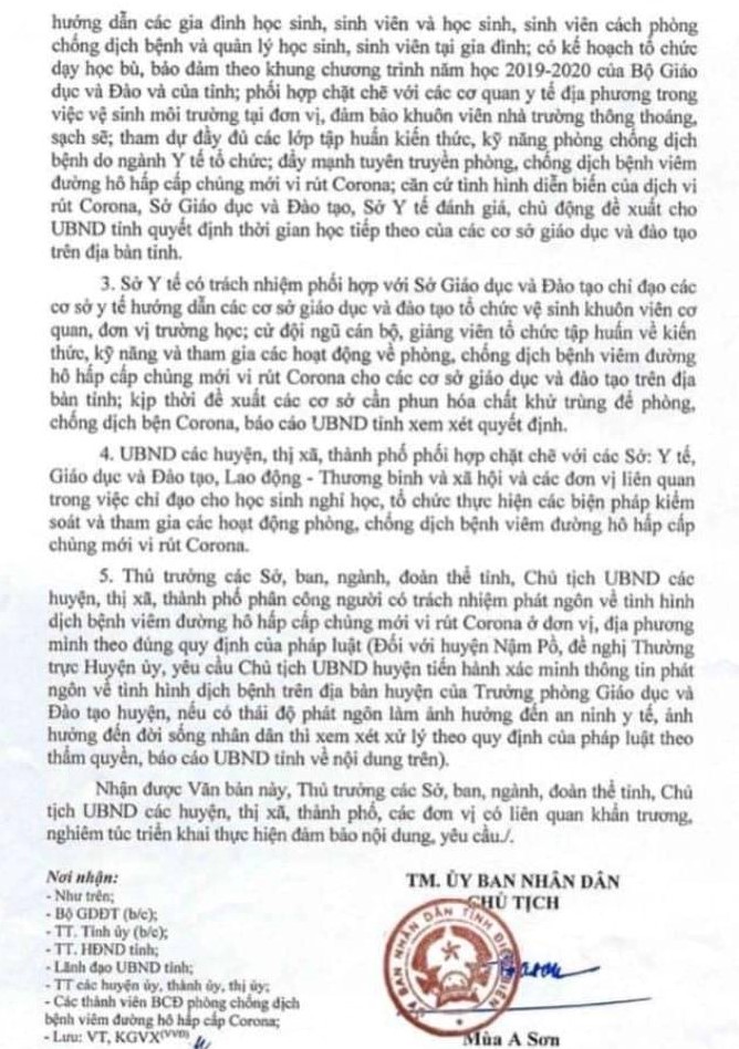 Thực hiện văn bản số 240 ngày 05 tháng 02 năm 2020 của UBND Tỉnh Điện Biên về tăng cường các biện pháp phòng, chống dịch bệnh viêm đường hô hấp cấp do chủng mới vi rút crona gay ra và cho học sinh nghỉ học để phòng chống dịch bệnh. Thực hiện hướng dẫn của phòng GD&ĐT Thành Phố Điện Biên Phủ, Trường MN Hoa Mơ chính thức nghỉ học từ ngày 06 tháng 02 năm 2020 đến khi có thông báo tiếp theo