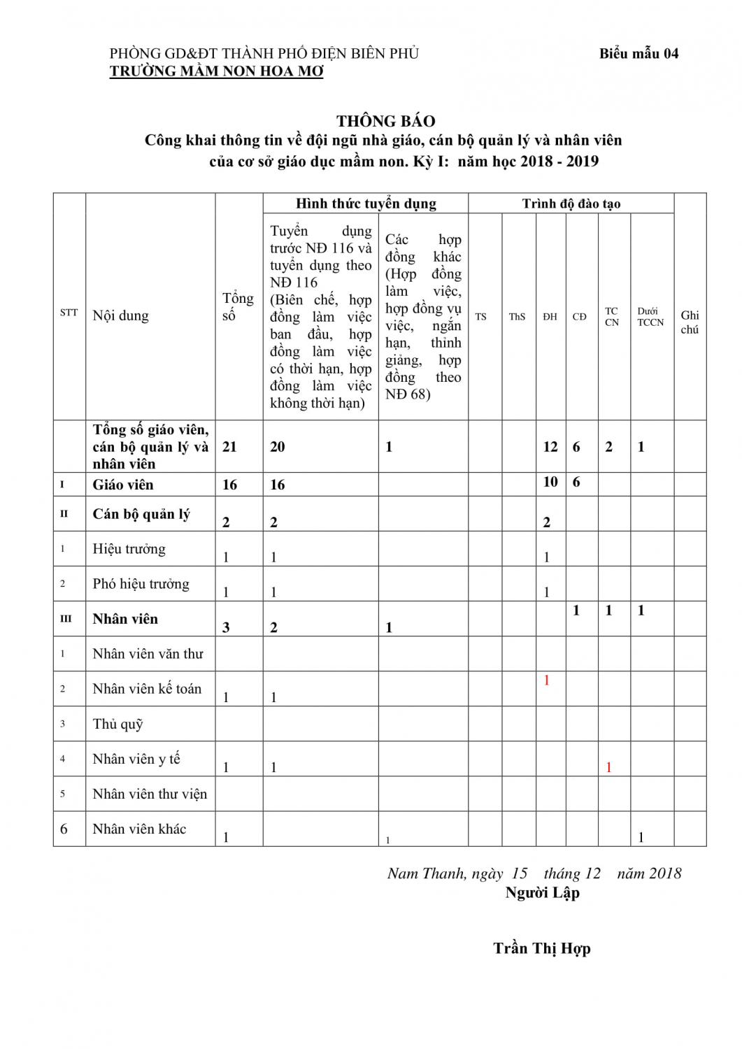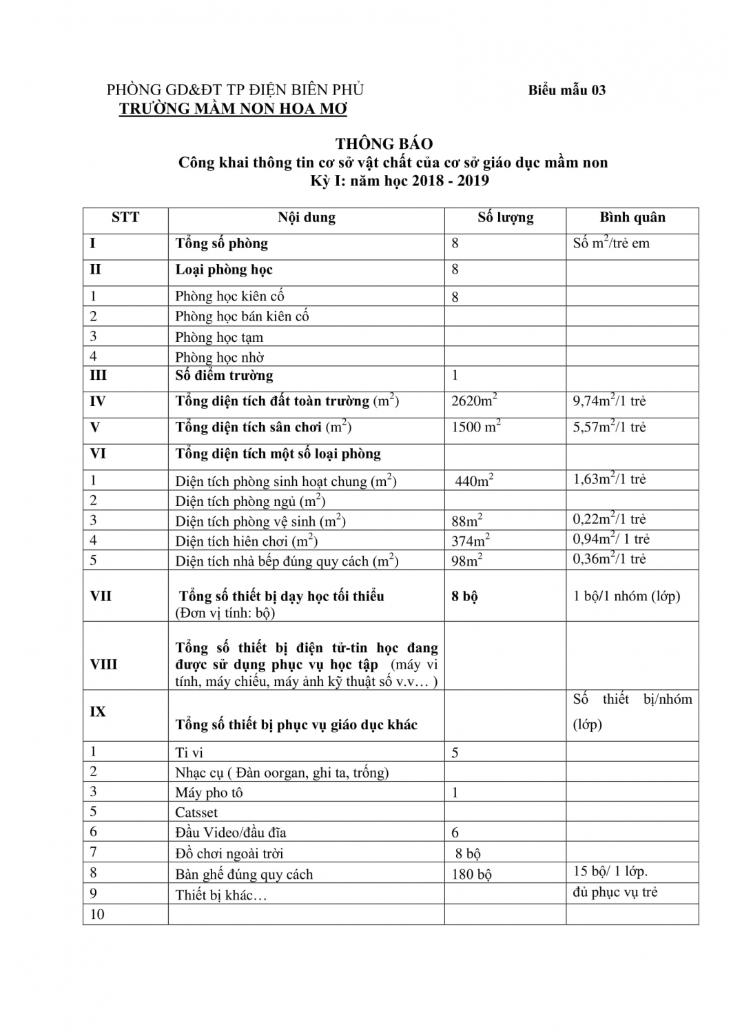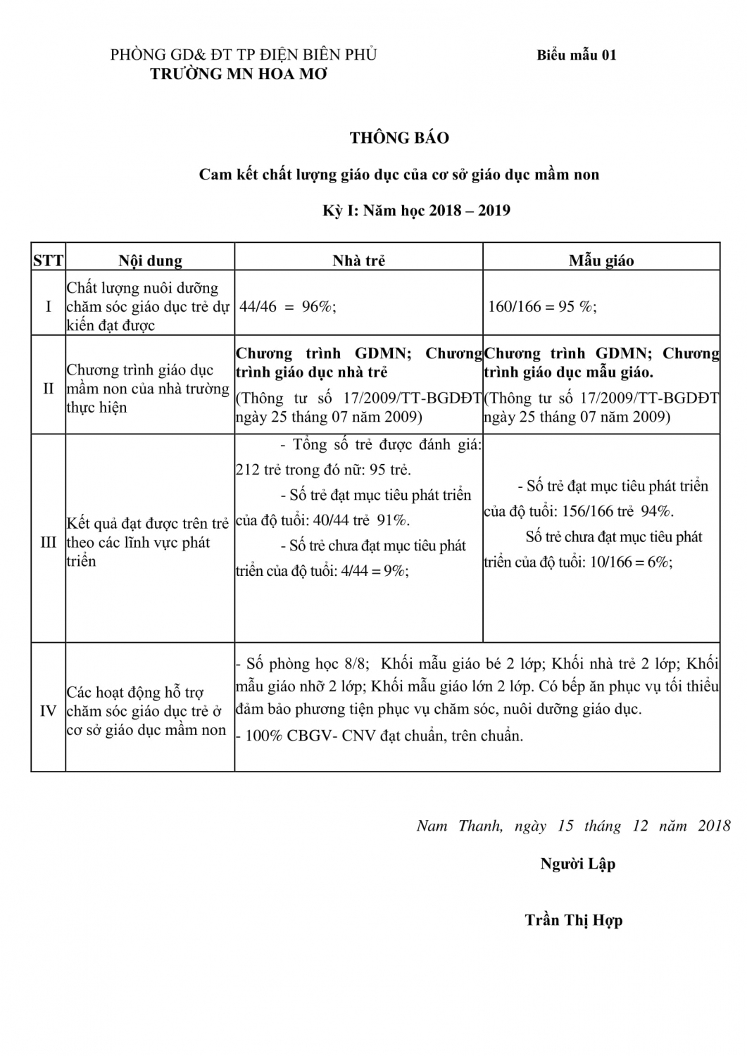 Trường MN Hoa Mơ công khai chất lượng giáo dục của cơ sở giáo dục mầm non Kỳ I: Năm học 2018 – 2019